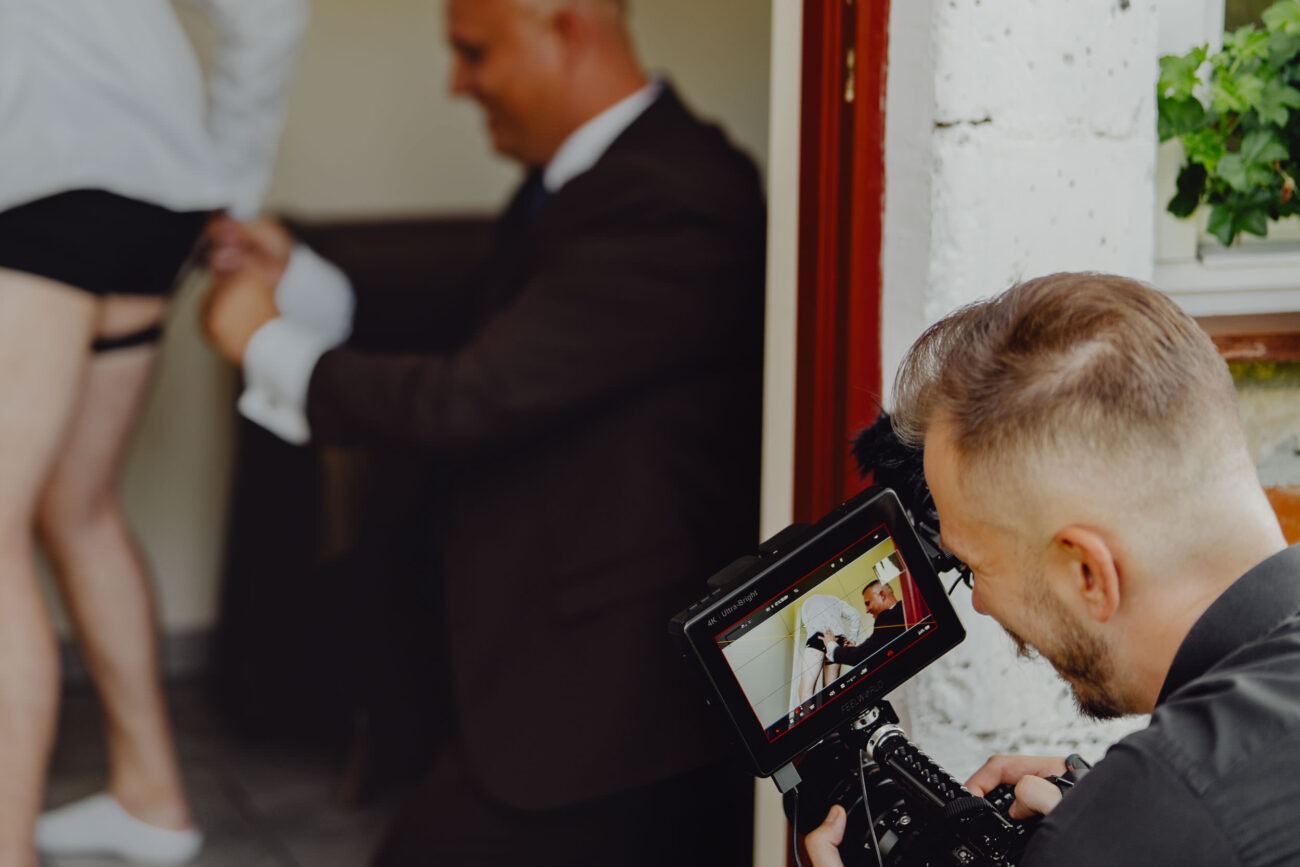 Słabszy kamerzysta – odhacza listę: zakładanie marynarki, zakładanie krawatu, kolczyki, suknia – wszystko z tej samej perspektywy co zawsze. Efekt? Każdy jego film jest identyczny. Znam pary, które miały tego samego operatora na trzech weselach w rodzinie i mówią wprost: „jakbyśmy oglądali ten sam film, tylko z innymi ludźmi”. Nie o to chodzi. W dniu ślubu dzieje się o wiele więcej niż sama garderoba. Warto mieć wideo ślubne, w którym widzicie swój charakter, swoje relacje i Waszych ludzi, a nie kopię filmu z poprzedniego weekendu.