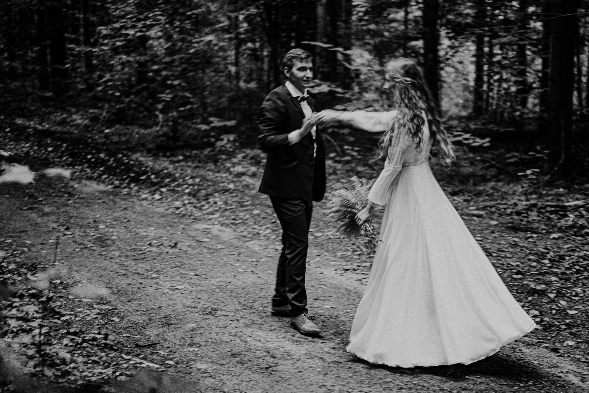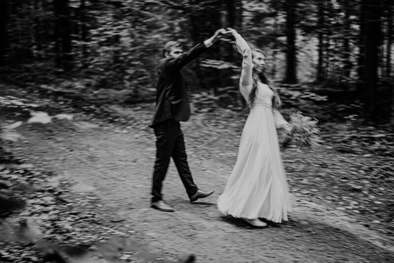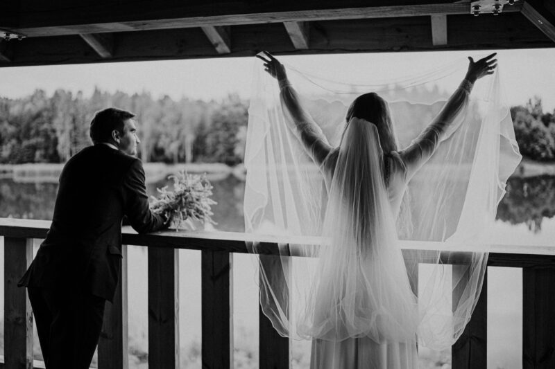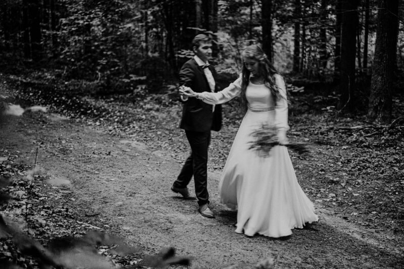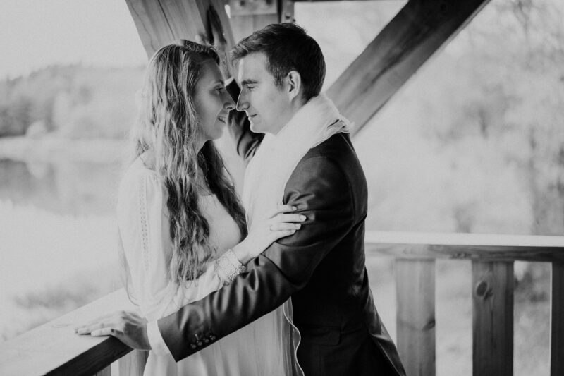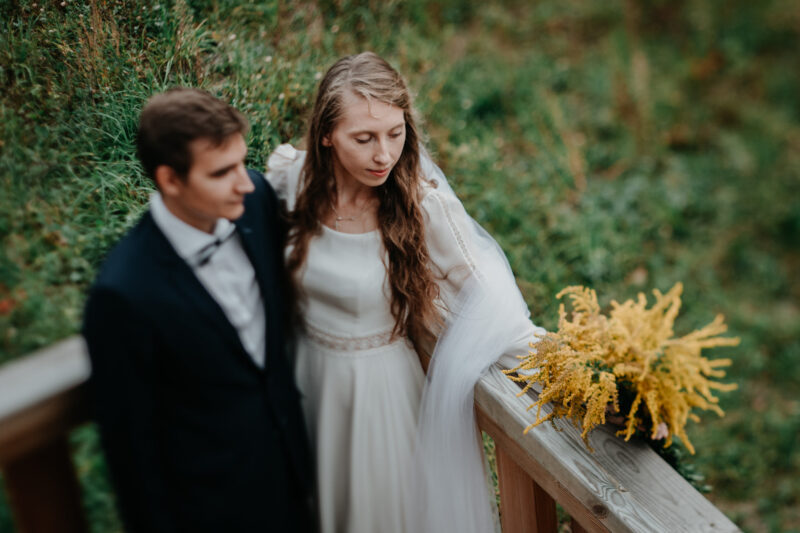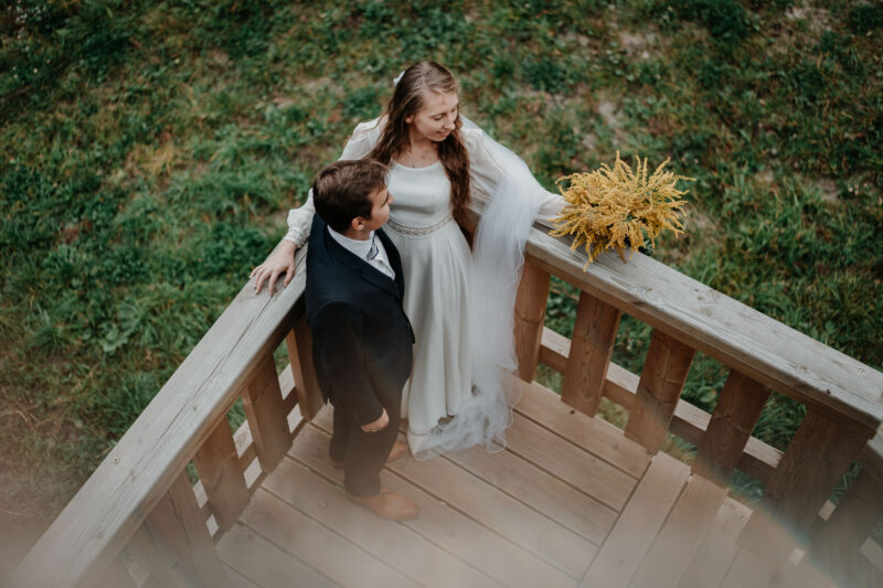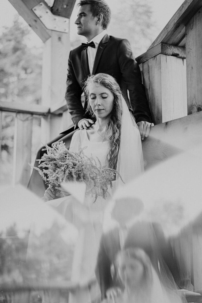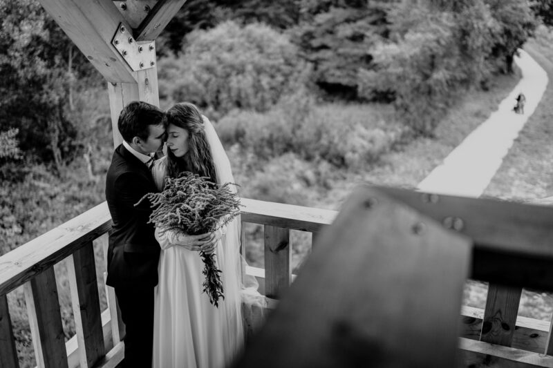Ta sesja zdjeciowa nad jeziorem przybrała naturalnie formę przyjemnego spaceru. Rozkoszowaliśmy się okolicznościami przyrody i oczywiście robiliśmy ujęcia. Chociaż to nie był mój pierwszy plener ślubny nad jeziorem, zawsze próbuję zrobić coś nowego, wyjątkowego. Tym razem postanowiłem w pełni wykorzystać możliwości, jakie oferowała wieża widokowa usytuowana tuż przy wodzie. To był strzał w dziesiątkę! W szczytowej formie (dosłownie :D), zaczęliśmy od samej góry i schodziliśmy sukcesywnie w dół. Na każdym piętrze odkrywałem nowe inspiracje, co motywowało nas do wykonywania coraz to fajniejszych ujęć. Zdjęcia przy schodach, klimatycznych barierkach. Fotografie z widokiem na urokliwie ciągnącą się wodę i cudowny las. Było magicznie!