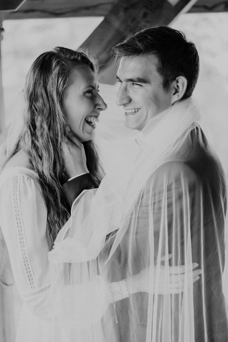 Karolina i Marcin czuli się nad wyraz swobodnie. Myślę, że dowodem tego są ich szczere uśmiechy, które upiększają niektóre zdjęcia. Zobaczcie sami! Po nietypowych zdjęciach na wieży i po tych przy linii brzegowej, postanowiliśmy eksplorować pomost. Tam zastała nas już noc. Znowu natura z nami “wygrała”, bo mieliśmy jeszcze wiele fajnych pomysłów i energii. Jednak trzeba uczciwie przyznać przyrodzie, że była bardzo wdzięczną towarzyszką i tego dnia stanowiła tła do wielu fantastycznych ujęć. Zdjęcia ślubne nad jeziorem to zawsze dobry pomysł, o czym znowu się przekonałem. Niezwykłym sprzymierzeńcem był też po prostu… mój sprzęt. Od niedawna mam nowy aparat, który charakteryzuje się elektroniczną, niemal niesłyszalną migawką. Karolina i Marcin nie słyszeli typowych pstryków, dzięki czemu ich swoboda była wręcz wspaniała! Nie widać żadnego napięcia ani pozowania. Zawsze robię wiele zdjęć, bo szukam tych najmniej wystudiowanych póz, najbardziej naturalnych ujęć. Myślę, że mnie to mocno wyróżnia na tle konkurencji! Stawiam na spontaniczność i nie pokazuję parom jakichś ustawionych inspiracji z mediów społecznościowych. Owszem, sam czasem przeglądam Instagrama, przyznaję się! Fajnie szukać, odkrywać, podziwiać prace innych. Jednak do swoich “modeli i modelek” podchodzę personalnie, starając się odkryć ich naturę. Po prostu ich.